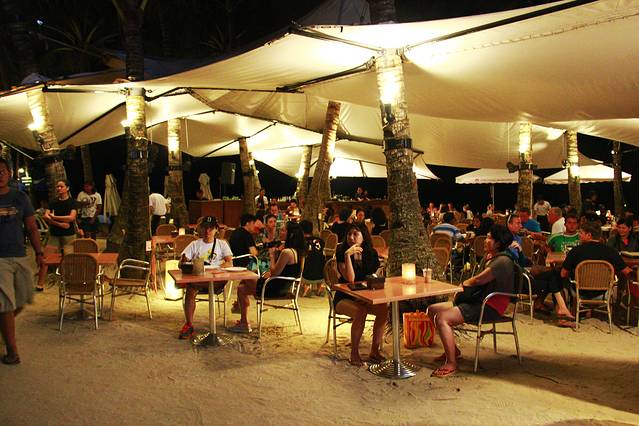 到了晚上沙滩边就会摆上这些桌子、开起沙滩餐厅或者沙滩酒吧。在这里享受海鲜美食、或者饭后来这里喝上一杯、应该是很好的享受吧