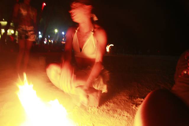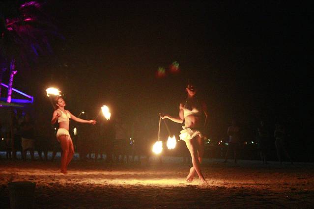 晚上在沙滩上散步的时候偶然看到了火把舞w~原本火把舞只是围在一个帷帐里不给外人看的..也不知怎么了就跳了出来、算是幸运吧w~跳舞的都是人妖、和着音乐、挥动着火焰..有种迷离的感觉...