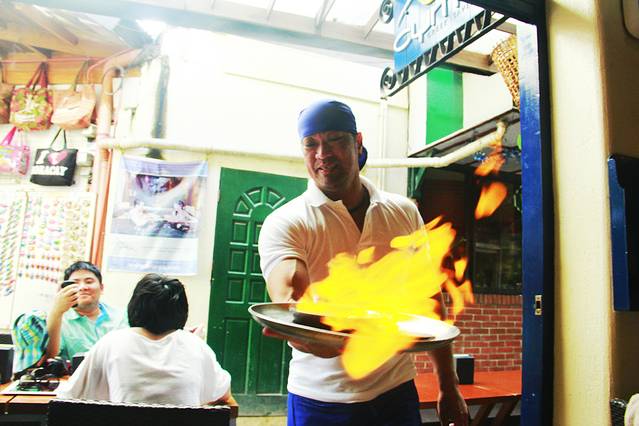 这是D'mall里一家叫CYMA的希腊餐厅。这家餐厅上菜很有特色、只要你点了内含芝士等的油很多的菜品、他们就会把菜拿到你面前来点燃里面的油w~火蓬起来的那一瞬间大喊一声。“YOOOOOOOOO~~”你的菜就来了w~