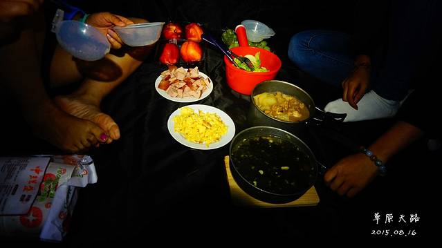 我们准备的还是很充分的,各种户外用的都带上了,没用多久,饭菜就弄好啦,开吃!得好好吃一顿,毕竟一天没有吃顿正经饭了~