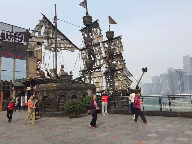 洪崖洞最顶层外面有一个海盗船