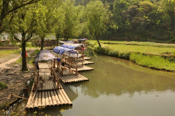 桥的一侧有个简易的码头,想要乘坐竹筏就去那里