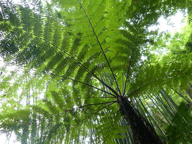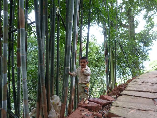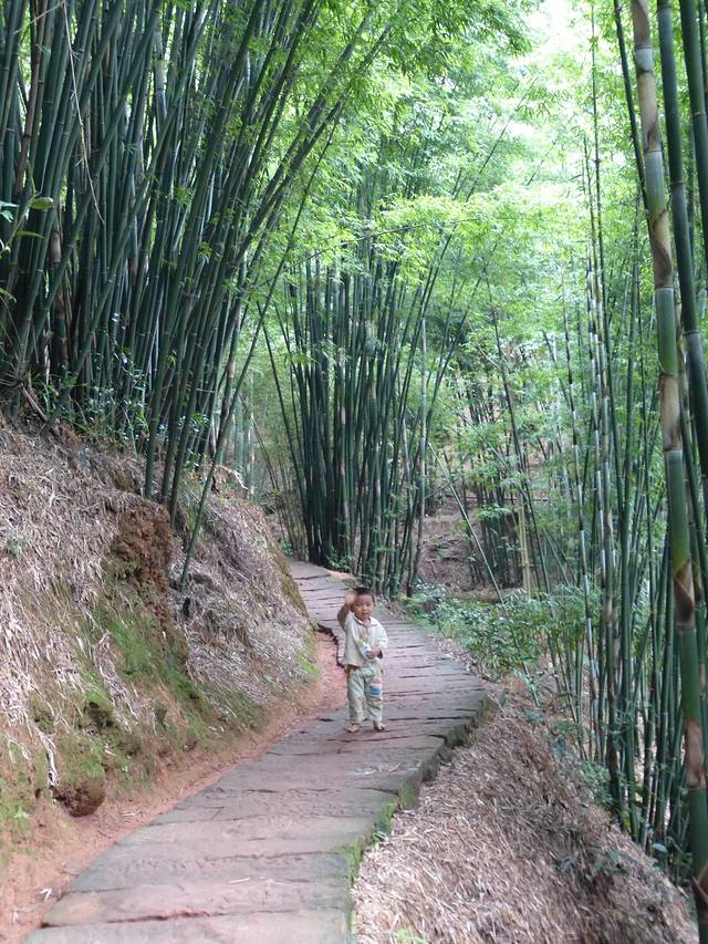 红石野谷的竹子与竹海的毛竹不同,竹杆稍细,竹叶比毛竹大,整体颜色要比毛竹更为翠绿。很多桫椤树长在这些竹子之间,像一把把撑开的大伞。到了山腰,小路稍显平坦,两侧的竹子向中间靠拢,石条小路伸向另一个山坳。不知道那边有什么,我只想在这样的小路上停下来,静静地坐一会儿,什么都不想,或者专注地想某个片段。转过一个山坳,有一户人家隐藏在竹林中。一丛竹子下站着一个两三岁的小男孩,皱巴巴的小衣服看起来很长时间没有洗了。光着一双脚,圆圆的小脸蛋,眼睛很大,怯怯的眼神打量着我们。等我们从他身边走过,他突然就跑起来,跑到我们前面。不知是因为害怕,还是想给我们带路。这样走了二十多分钟,离他的家越来越远,前面也没有人。同伙都担心起来,叫他停下回家,他依旧不睬。直到薰衣草跑上前去,给了他一瓶纯净水,他才转身回去。经过我的身边,我向他招手,他转过身来也向我招手,我急忙按下相机快门。回来后,一说起赤水,我就想起那个小男孩明亮的眼睛和光脚丫。