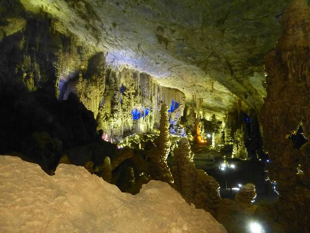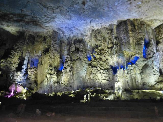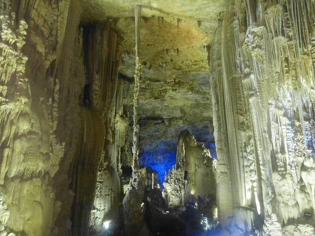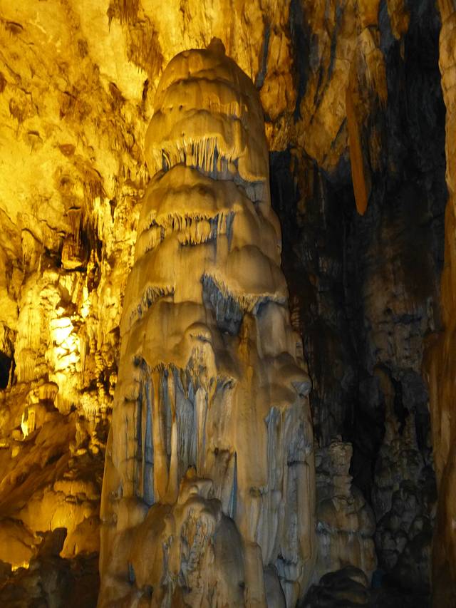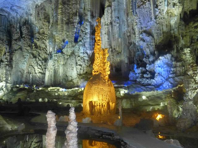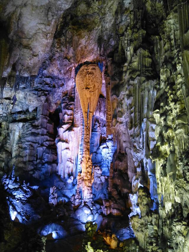 洞顶的水滴无声地落下,石笋、石芽随处可见,形状千姿百态。淡黄色的居多,看起来很软。我忍不住躲开导游的视线,伸手去扣,却是很硬的,确凿是石头。导游解说着各种人们主观臆想的名字。印象最深的一个钟乳石是“霸王盔”,金色的灯光从底部照射上去,的确像极了古代武士的头盔,威武雄壮。其他很多圆柱形的钟乳石在我看来就像一根根坚挺硕大的那啥(嘿嘿!你懂的)。