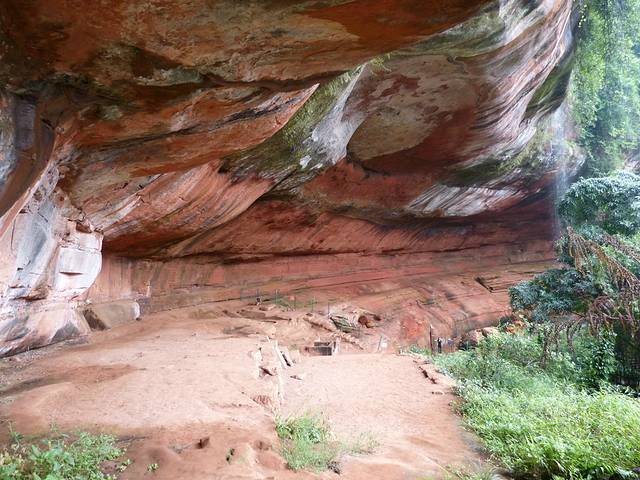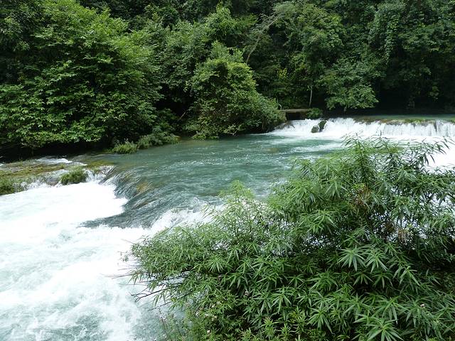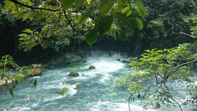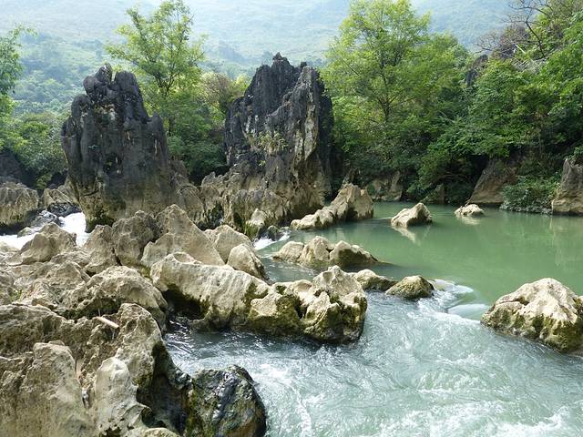 黄果树景区其实很大,还有两个景点,一个是陡坡塘,一个是天星桥。陡坡塘没有什么特点,按下不表。进入天星桥,走过了刻有日历的365块石墩,到一个宽阔地带的游客服务中心,被告知前面的景点因维修设施不得通行。正在踌躇间,一个抱小孩的当地妇女对我们说,给她50块钱,可以带我们走一条小路到前面的景点。香樟树上前舌战,最后说定30元。于是那个妇女在前引路,从一个拉着禁行的横条的路口进去,来到一个山谷。穿过山谷,就看到一条长时间没有人走过的景区有栏杆的小路。