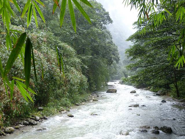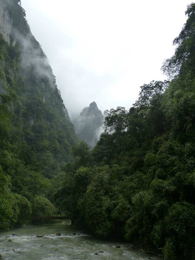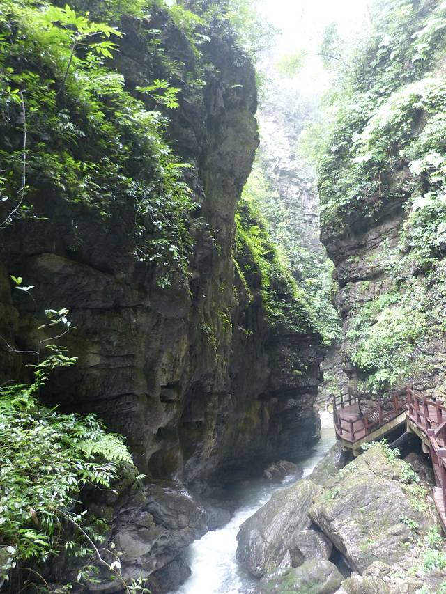 黑山谷是一条幽深的峡谷。植被茂密,尤其湿润。树木油绿,叶子上的水滴无声地落下来,打在头发上、脖子里却不觉得凉。沿着谷底一条清澈的小河走在栈道上,觉得空气吸入后是一种难以言说的舒服。组长今天心情大好。一路拿着手机拍视频,还少见地摆出姿势自拍。
