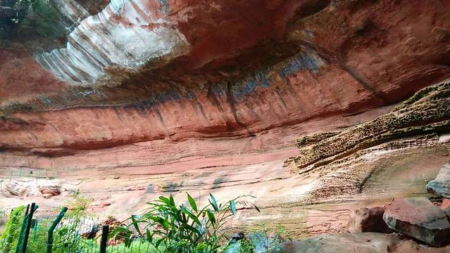 山顶上就是传说中的赤水丹霞。半圆形的自然坍塌的崖壁。奇怪的是,这个崖壁横着在中央有一个巨大的凹槽,裸露着淡红色的岩石,有两条小瀑布从崖壁顶上飞泄而下。之前百度赤水,丹霞这张照片特别吸引人。岩石的颜色非常红,横向广角拍摄,也很壮观。实际上真的没有那么好看,宣传的力量的确强大。