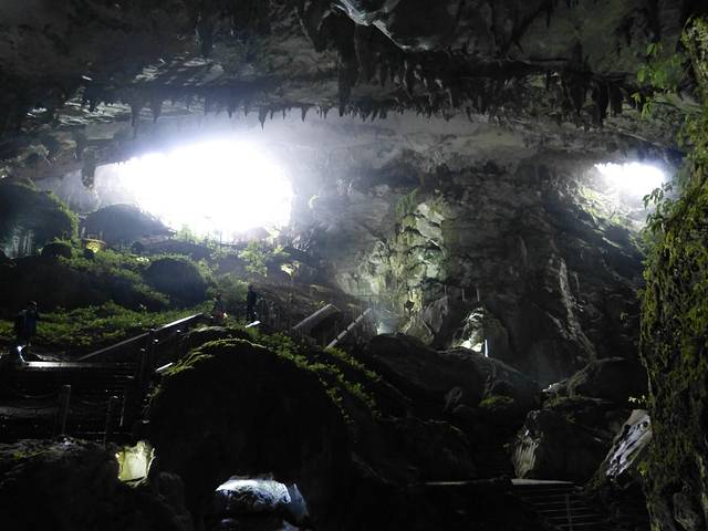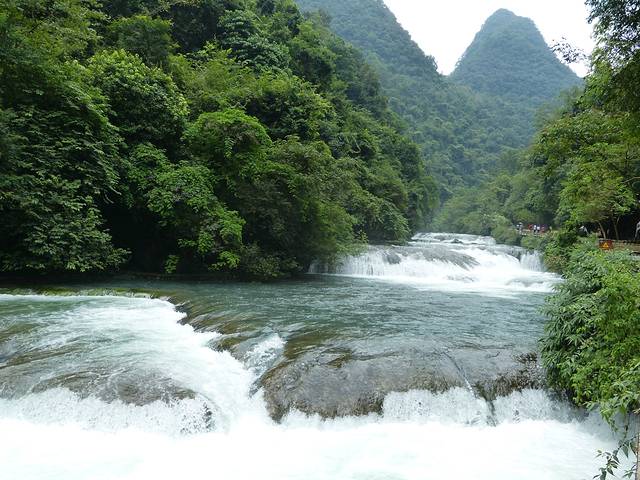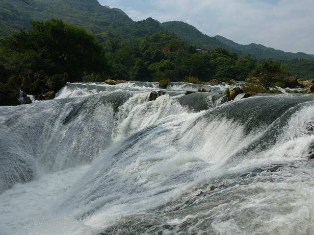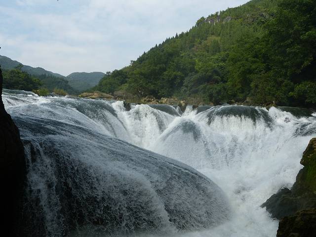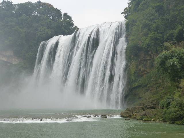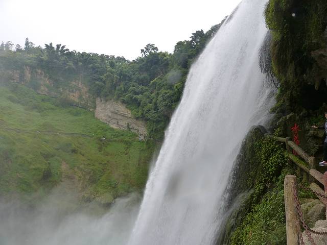 5A级景区游人很多,但大部分都是“夕阳红”跟团来的,操着各地的口音。在看到黄果树瀑布的时候,觉得它一下子动起来了,巨大的声响和水流冲击产生的水雾让人印象深刻。沿着瀑布前方潭边的小路迂回进入瀑布里面,从水流的空隙(说是空隙,那是从下面看,进到里面,那空隙有两三米宽)里向左右看,巨大的水柱从头顶飞过,让人不敢相信身处在瀑布当中。