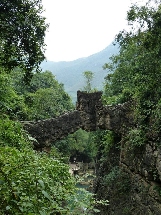沿着这条路,才看到天星桥景区的精髓所在。天星桥其实应该叫天生桥。在桥的中间,有一个像长城烽燧一样的结构,看不出有人工雕凿的痕迹,烽燧的顶端还长着一棵小树。从这个烽燧结构到两边,是两块分离的石头,靠着重力稳固起来,能看到两条明显的裂缝。我走到桥上向下看,深深的谷底有一条湍急的溪流,感叹大自然的鬼斧神工。