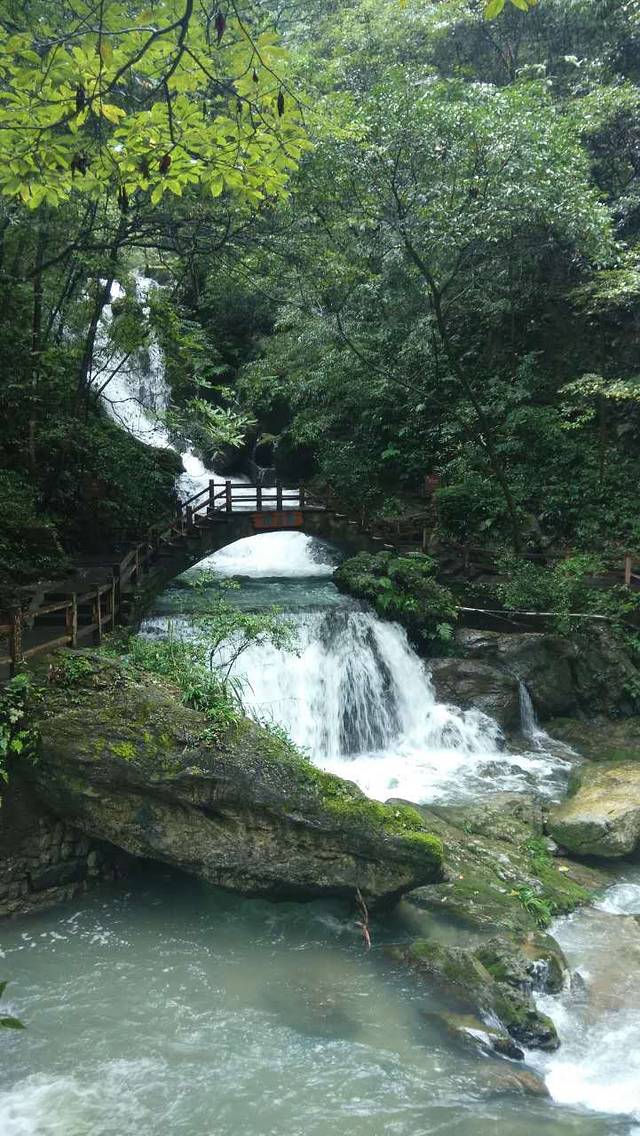 银链坠潭瀑布名字很拗口,却是瀑布群中最有特点的一个。湍急的水流从一个个巨大的圆形石头上倾泻到深谷里,因为坡度缓,水流的轨迹明显,在深潭里打着转流下去。我总是想找一个最佳的角度去拍摄全面,拍了好几张都不理想。转身离开的时候,发现同伙已经走了。前面有一个三岔路口,对比着看哪一个更宽一些顺着往前走,转过几块巨石,豁然是另一种景象。栈道悬空,两边都是水,水中耸立着炭灰色的石头。原来到了水上石林。四周巨大的水声,我在水的中央,前后没有一个人,不由觉得有些害怕,急忙加快脚步追赶同伙。等过了飞瀑桥,就到了水流的对面,还看不见同伙的身影。于是给组长打电话,报告我一路经过的地方,才知道我不知从哪个路口走错,已到了他们前面。坐在路边等同伙的时候,觉得后背已湿透了。等到同伙出现在眼前,组长问我,如果迷路了你会怎么办?我老实说,只能给你打电话了。组长嘲笑我,怎么跟小孩儿一样?