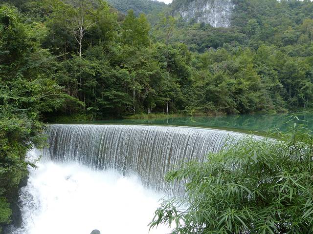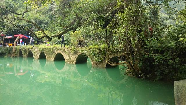荔波真是紧挨着广西,一下子热起来。一座座独立的山也像桂林了。很多人到小七孔来就是为了心中的那一块碧绿。九寨沟的水是清澈见底的蓝绿色,小七孔的水是浓重的凝滞的碧绿,仔细看才能发现流动。光线再暗一点,那碧绿就更加恬静,绿的纯粹,有质感。