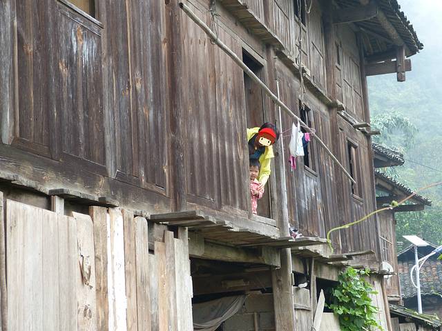 薰衣草和小女孩在她家的木楼上招呼我们上去