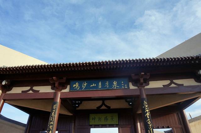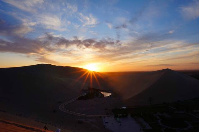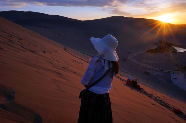 月牙泉的周围是高高的沙山,中间有一个形似月牙的小湖。鸣沙山在晴天或有人从山上滑下时会发出声响,所以叫鸣沙山,这里还有一个奇特的现象,因为地势的关系刮风时沙子不往山下走,而是从山下往山上流动,所以月牙泉永远不会被沙子埋没,被称为沙漠奇观。