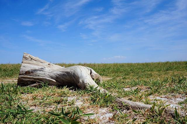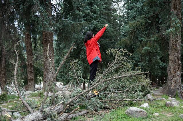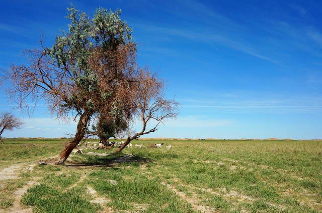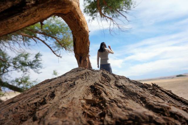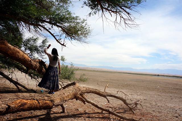 坐在粗壮的树干上~看沙漠,隔壁,草原,湖水,与雪山交相辉映。