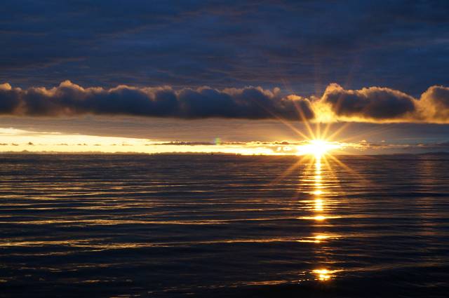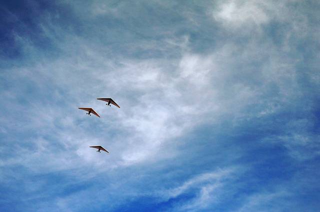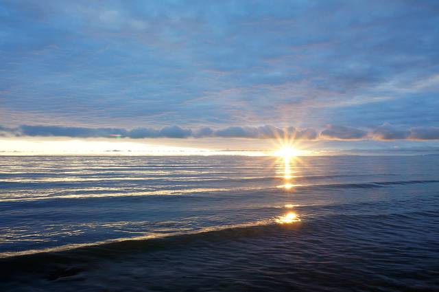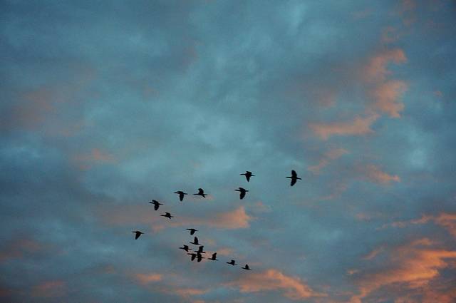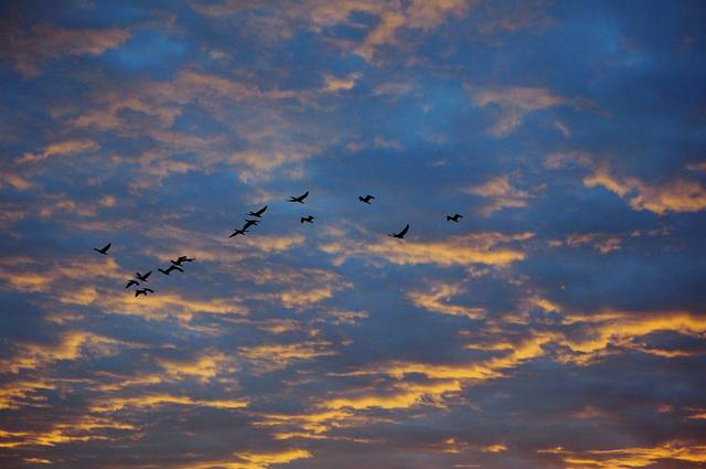 天空中的云彩也染上了金边。鸟儿成群成群的飞过。