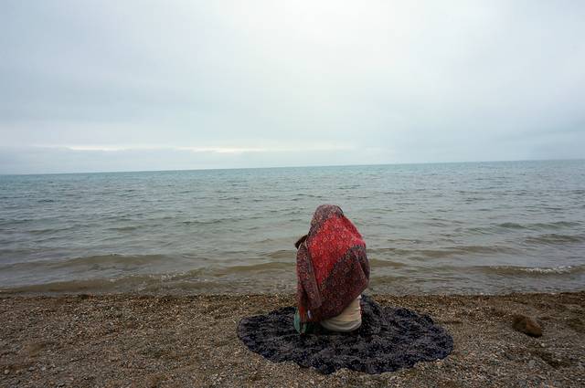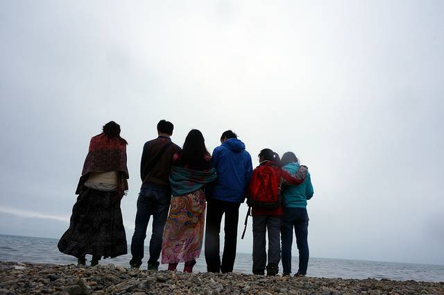 走到湖边,大家相互打闹,笑那些披着被子出来的游客。