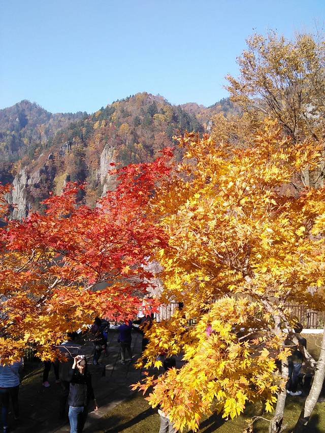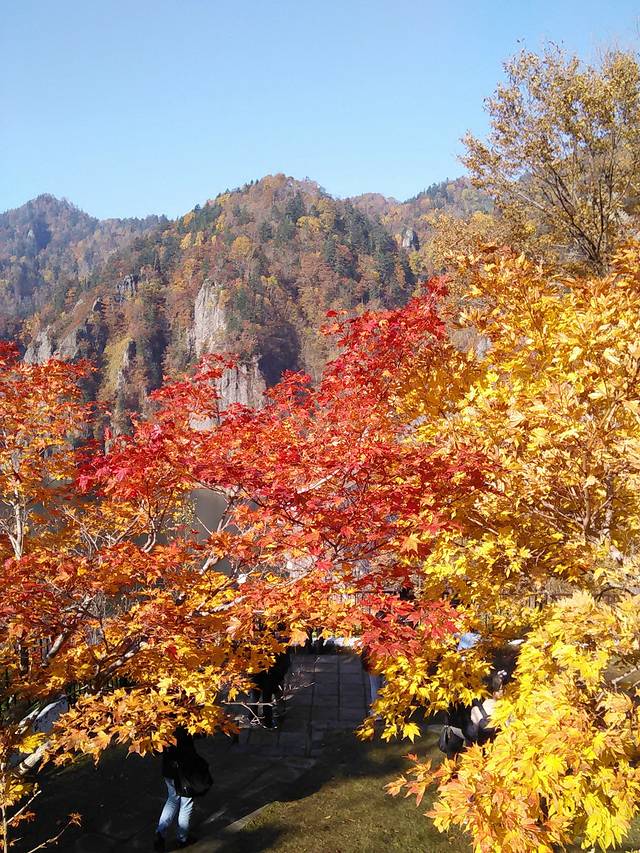 丰平峡水坝要坐电频车进去,有缆车上去,要排队。我们是走上去的,观景台下有2棵枫树顶正好成了拍照的背景,周围的山五彩缤纷,赏心悦目。