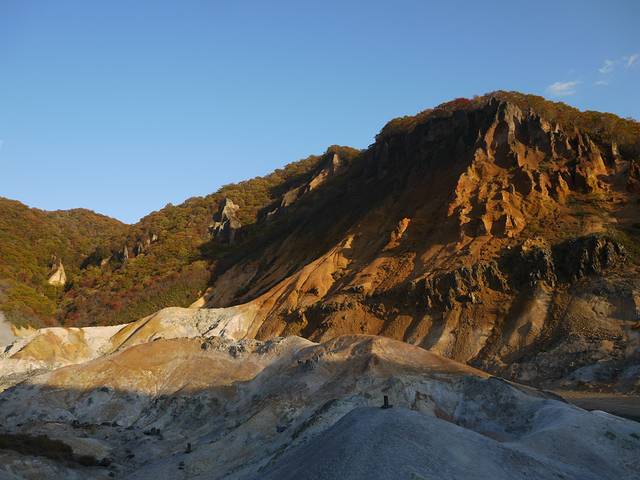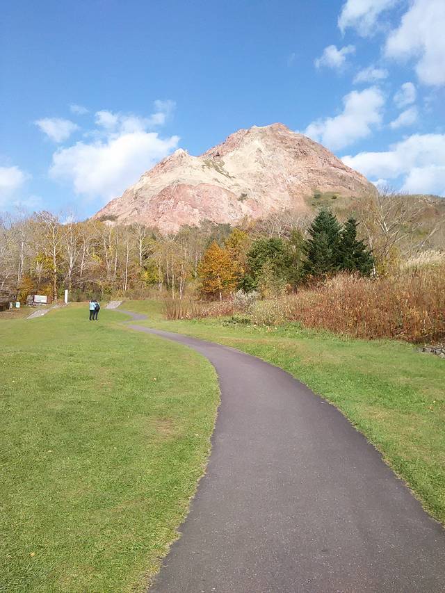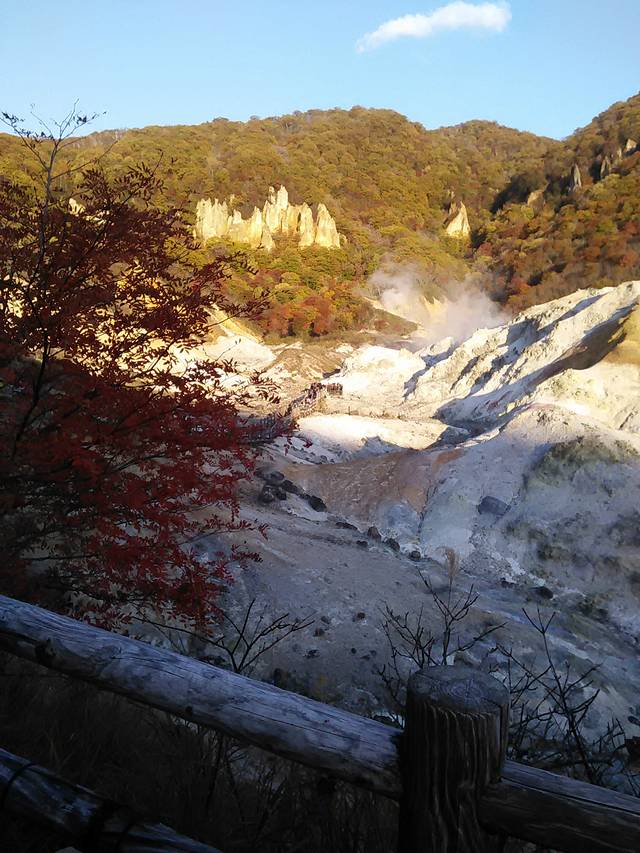 昭和新山地狱谷在枫叶色彩的映衬下,别有风光。