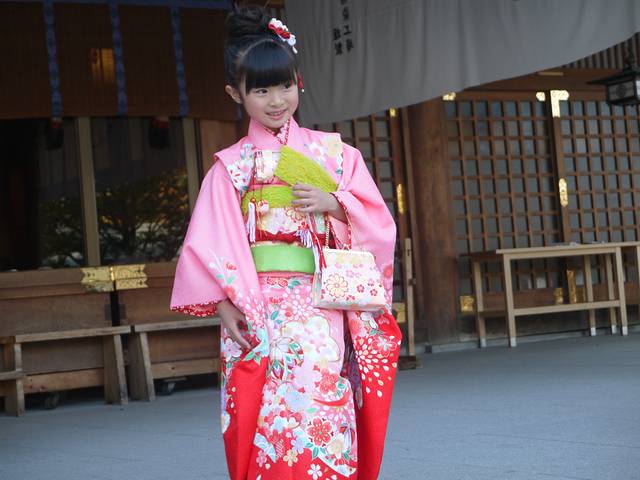 孩子祈福,女孩穿和服脚踩木屐,男孩则是武士打扮。