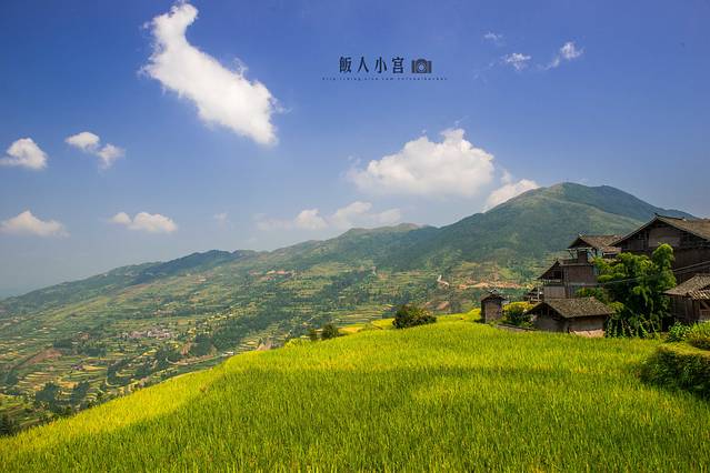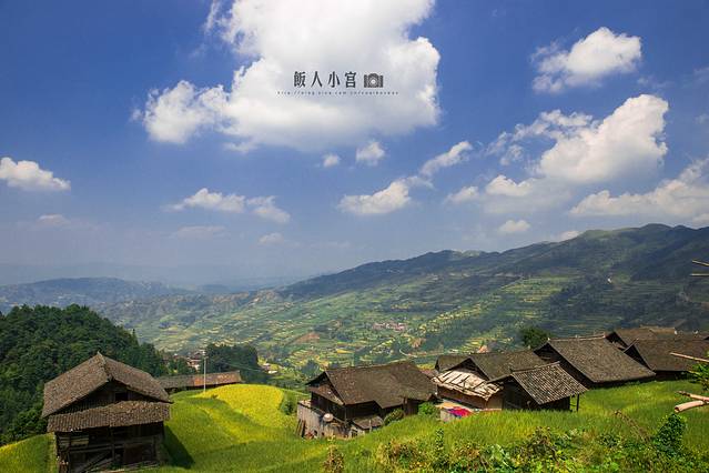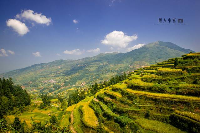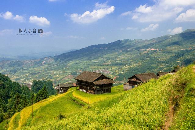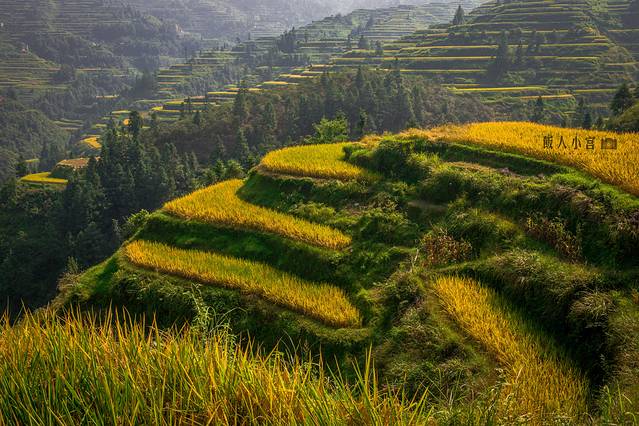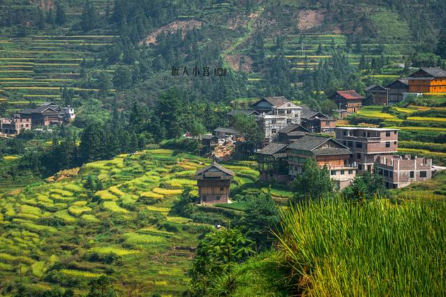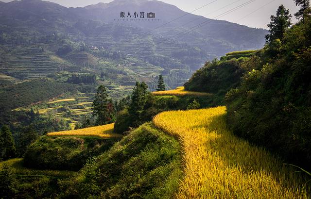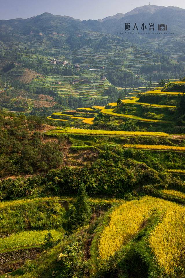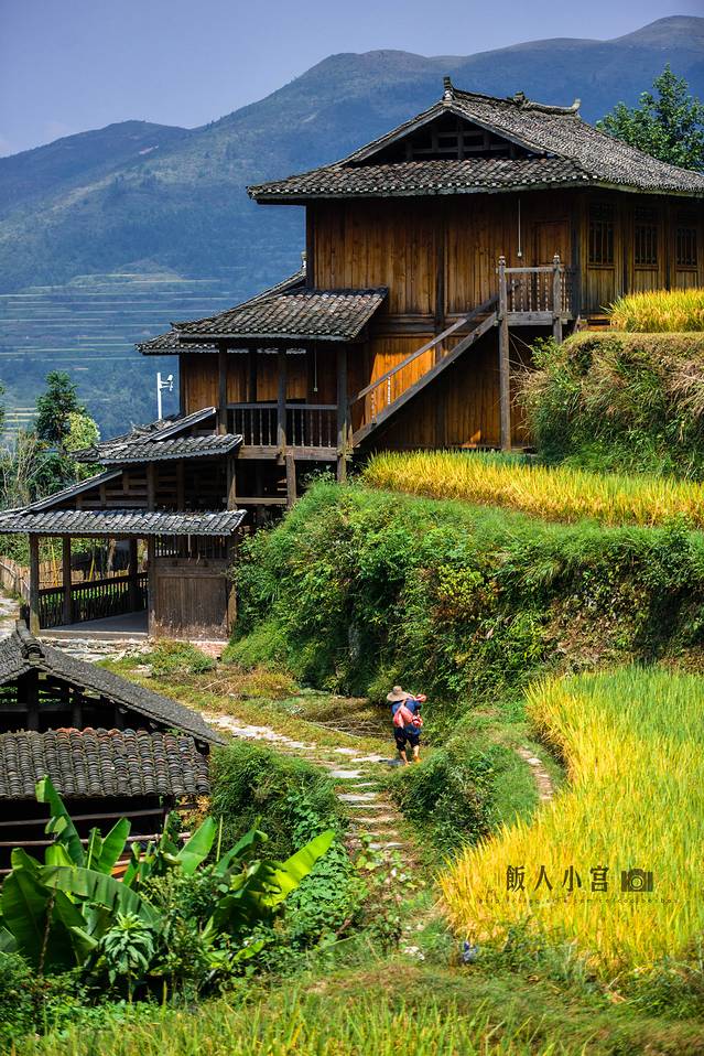 越走越高,离终点越来越近,风景也变得越来越美。高角度看梯田,果然是更加美妙,而且远处能看见一撮撮的侗寨夹杂在这金黄的世界中,映着蓝天和白云,是那样的美轮美奂。再走没1小时,终于我在层层梯田之上,发现了堂安,一座孤零零的小侗族木屋,如同一只小精灵般欢快的出现在了田野之上,再往前走几步,一栋栋小木屋接二连三的出现了,就像草原上的鼹鼠将头伸出地洞的感觉,真是太奇妙了,任谁见了心情都会变得大好