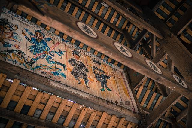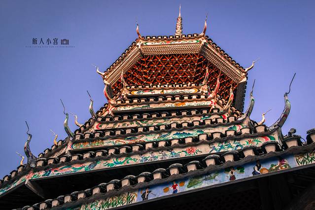 沿着寨子大路进去,两边的木屋与苗寨并无太大的区别,不过当你走到大路中心地带,面前突然出现了一座形似宝塔的建筑,立马将整个画面的焦点集中于此,这种特别的建筑正是侗寨的标志:鼓楼。这个远处看起来像一座黑白色宝塔的家伙,走进了才发现并不是如此:全部是木质结构,下面由四根大杉木支撑,直通塔顶,周围还有若干木柱共同搭起,鼓楼每一层之间都有空隙,下宽上窄,最奇妙的是在每一层塔面上都画着五颜六色的画儿,而且细看每一层的画还都不同,有动物,有人,有花草,看的人啧啧称奇,在每一层的边缘都会有弯曲上翘的似塔尖一般的收尾,最上一层会和其他层面间隔更大一些,高耸的塔尖在夕阳的印衬下分外显眼。