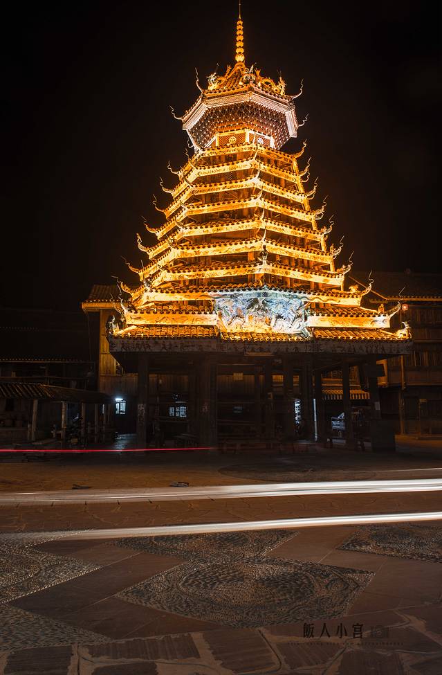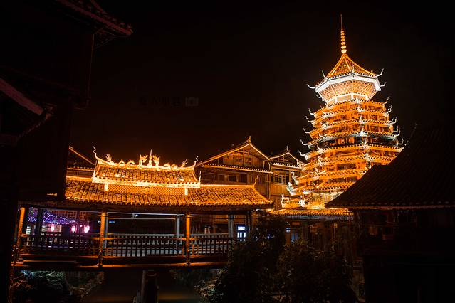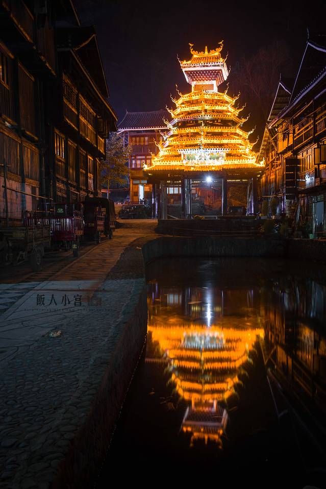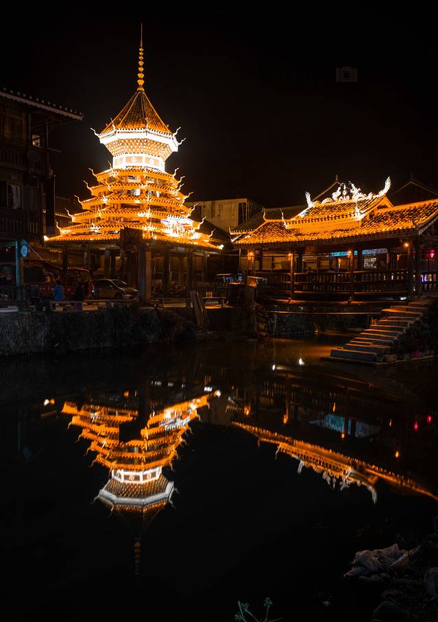 出来,发现“鼓楼们”都亮了起来,原来村民已经在这些“宝塔”上安装了灯光,金黄色的光芒在黑夜里格外显眼,河水将这迷人的夜色倒映了下来,煞是好看。