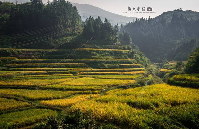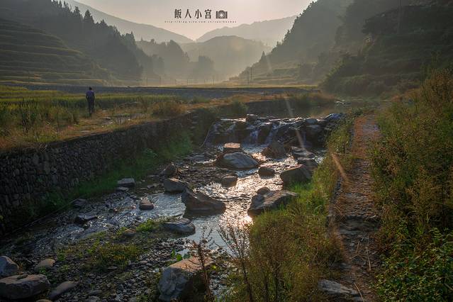 翌日清晨,跑到寨外的一处高地,准备建观景台的地方拍摄全景,不过角度还不够高,效果一般,清晨雾气比较重,而因为地势较低,周围山高,所以等阳光出来的时候,太阳已经不低了,并不能拍到日出的效果。不过寨子外的田野别有一番风景,黄绿相间的田地被朝阳的光芒映得色彩更加浓郁,山山水水都披上了金色外衣,从睡梦中苏醒了过来,一条并不明显的石板路,在阳光的斜射下,指引着寨子的方向……