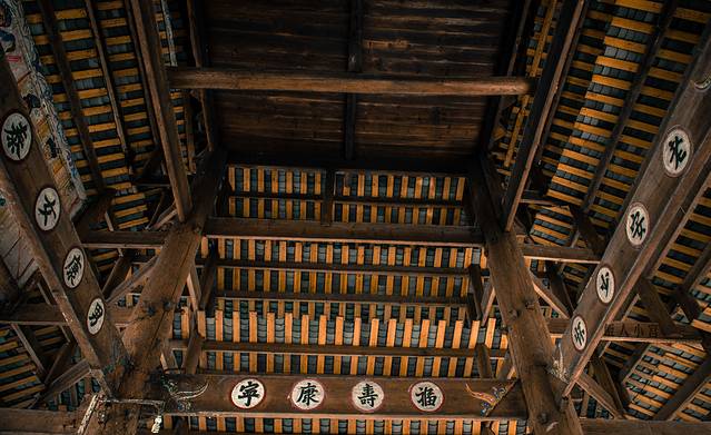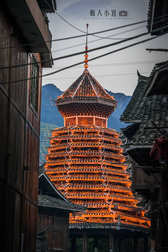 鼓楼名字的来历,传说是三国时期,蜀国诸葛亮南征,在侗乡一带扎营,为方便指挥,在营中修建高亭,内置铜鼓,以鼓声传令,故“鼓楼”一名由此而来;更有夸张的说法是鼓楼为外星人所建,是飞碟和火箭的发射架。当然不管鼓楼有何而来,如今的它是最能代表侗族的建筑,这一点是毋庸置疑的。鼓楼的下半部分,是中空的,类似于一个微型小广场,是侗族百姓休闲的场所,不管是村里老人聊天还是年轻人幽会,亦或是接人待客,遮阳又挡雨,真是绝佳的地方。