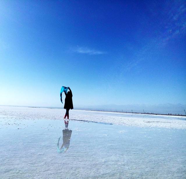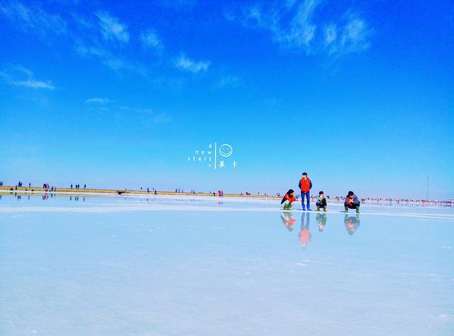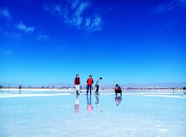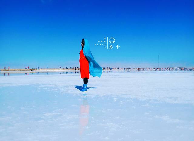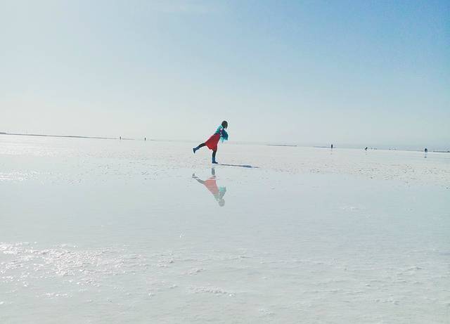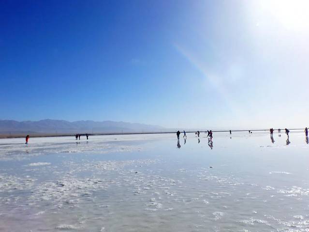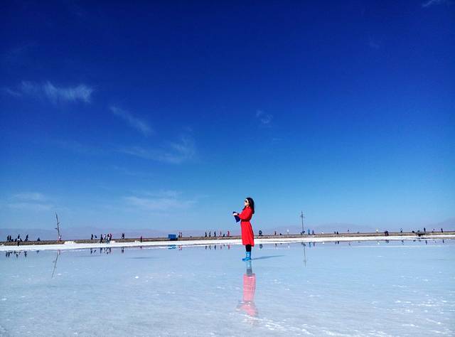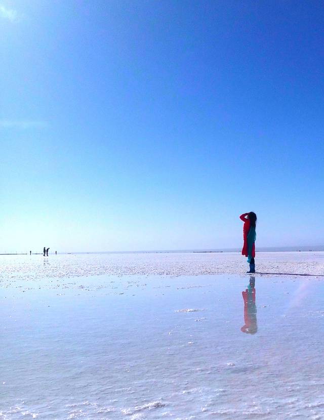 看完日出,我们便匆匆去往美丽的茶卡,这个与玻利维亚乌尤尼盐湖媲美的"天空之镜"。走进盐湖,我只看看到了白茫茫的一片,耀眼的阳光照的我睁不开眼睛,天空映在浅浅的水面,这一刻仿佛自己置身天堂。