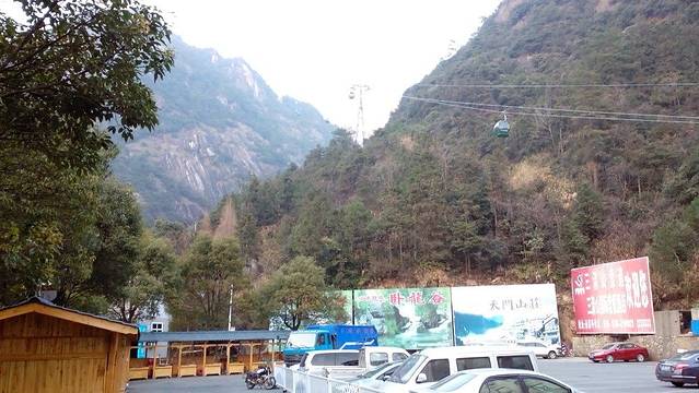 10分钟缆车到上站,行驶速度不快,8:57来到天门山庄牌坊门口,再上走台阶右转进就是山庄大堂了,正对门的是关公黄杨木像挺大蛮威武的,右边上是小卖部有卖玉米(10元1根)鸡腿(10元1个)等, 我已预付了今晚双人房费452元,是限时特惠价。