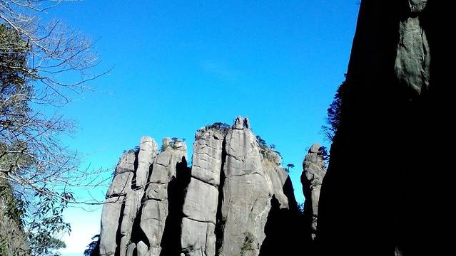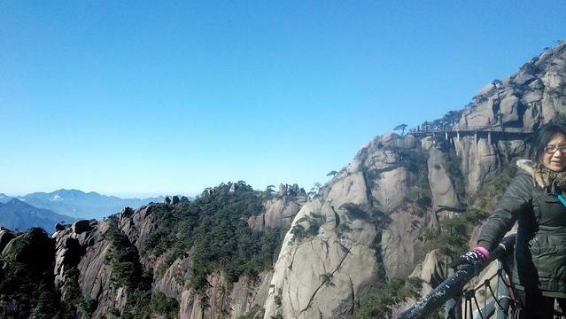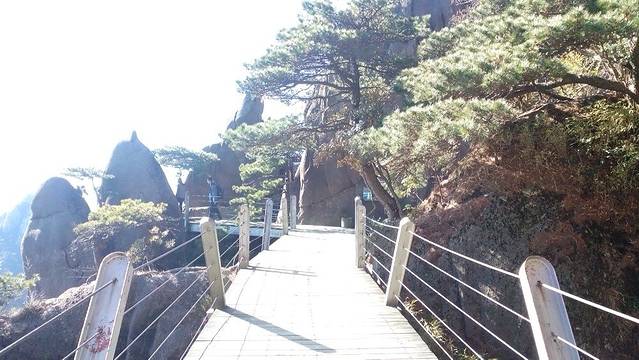 在栈道拐角处有壮观的花岗岩群聚地貌景观,玻璃地板飞台上别忘留下你凌空的仙姿!坐亭子休息时喂喂松鼠们与小精灵共尝美味(它们最爱坚果类口味别太重)不亦乐乎,还有渡仙桥摇摇晃晃晕晕乎乎颤颤巍巍过深谷奥