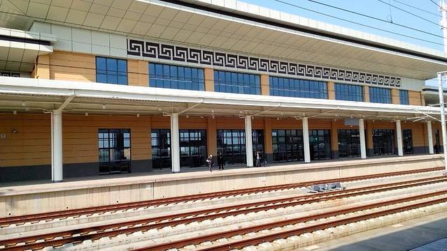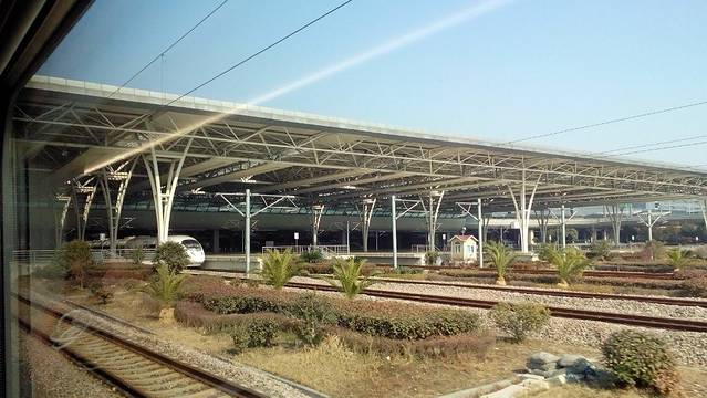在1号月台上等时我站队伍(她们按地上车厢号标记站位)几米外边上,也没去排队反正有座的行李不多就一个背包后上也没关系,结果还真有趣火车2车厢门就停我面前只偏一点点,那帮诚心排队的估计心里肯定不平衡了,停靠的时间还是蛮宽裕的9:51准时开,车上一货真价实的大美女也是开口帅哥的套路要和我换位和同伴坐一起,我吃的东西都铺开面前板上了包也行李架放妥了,再说你要是到中途站的到时我还要让后来客再坐回来,所以回答她一共才两小时多还是算了吧,如果时间长也就跟你换了,她后来和同伴旁边位小伙子换让他坐我边上的,也算称她心意了。我在靠窗车右座,阳光明媚前面的小伙子还嫌光太强把窗帘拉下,冬天都不愿晒太阳你什么时候晒啊
