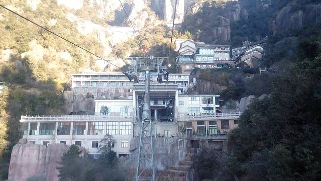 8:38走到游客服务中心里面游客没几个,先买门票80元(平时150元)再买索道往返通票100元(上55+下45,平时70+55),我事先还问过外双溪南索道。买往返索道票如南部上东部下也可以三日内有效方便住宿山上,女的拿手机二维码扫我手机里索道票预订短信时还问我现在价格现场买不是一样的还网订干嘛?!我说订房时一条龙解决算了,再说大多数景点网购取票和现场购票都是分开窗口想能节省排队时间,但三清山南这可能冬天是来人少所以门票索道票都只有开了一个窗口。进索道大厅不用排队检门票过闸后再马上撕索道票的上行边,我前个缆车里坐了六人,我进下个缆车时身后正好还没人来,竟然我一个人包厢!这可是在黄山这种热门旅游山想都不敢想的速度和待遇啊!