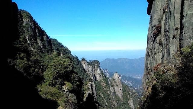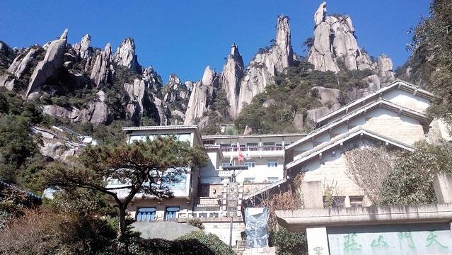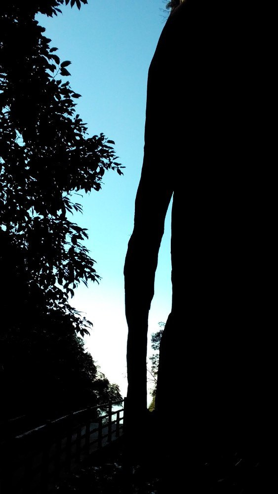 9:29出天门山庄后门前照了几张先和环境融合下,然后右走向上登台阶,头顶就是这天门群峰,这名称有气势还让我想起了诗仙李白坐船过安徽当涂县作的“天门中断楚江开”的诗句,现在我看到的可是天上银河冲出的天门啊!诗仙地下有灵指导下我该怎么形容吧...