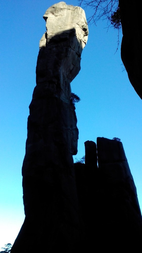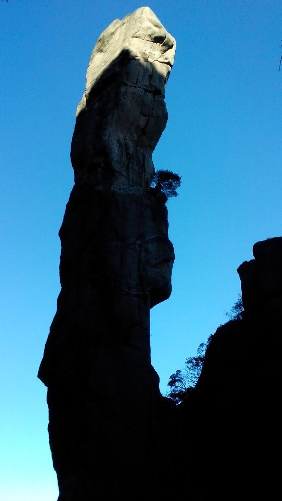 吃完再左转就能渐渐接近东方女神了, 从远至近以及侧面有较长一段路神女一直在视野里,神女如果披肩发就更美了。我让三脚架的一对主人中空着的女的帮我拍照,那男的一个劲的在说幸运!听到大概第七遍感慨我反正照片留影也完成了,忍不住问他拍到什么奇景这么幸运啊?!他迫不及待地给我看相机,原来是一枝斜云正好挂神女前上方头顶!我来形容的话犹如神女云鬓上的白玉簪浮现头顶前!旁边女的说在这等一年总等得到这样的情况吧!男的兴奋得说等几年都不一定等得到欧!而且他很虔诚奥,给我欣赏完收拾好器材后为了感谢上苍对他的厚爱竟然立马朝神女前方下跪连磕了几个头(当然不是咚咚撞地起包的那种),旁边经过游客看到他磕头神情表现有点蒙,大概以为这哥们在朝神女许愿或保佑吧,看他这样兴奋我也为他开心,说明他对追求摄影好作品很投入也是很懂得感恩大自然的!哥们!好好拍,哥看好期待你出传世神作!