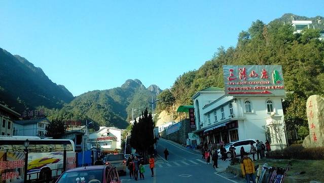一共只有五家(世界自然遗产关拆掉一些住宿),南部这四家由下到上排列天门群峰下是梯云岭宾馆,天门山庄,再往东北方南清园里大三清酒店。东部那一家神女宾馆。 位置最方便去四面八方能避免回头路,我问住客是晚7点到八点半热水澡,经过看到一荤二素快餐40元也能现炒菜,天门山庄里小卖部鸡腿10元玉米10元,门前也有个小吃亭还有人帐篷搭旁边,天门山庄餐厅八点起早餐没预订就多数吃不到什么,我也是早去再加上让服务员小妹有好感的模样没预订吃了白粥和一个小菜共30元,本来想吃不到就去山庄去吃的,后面客人有的说预订过的也差点被推说没记录吃不到。