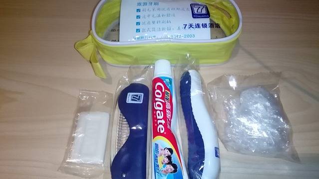 7元大堂总台旁酒店超市买的洗漱包,再买了小包洗发液觉得卫生间里那种零散添加的不好。