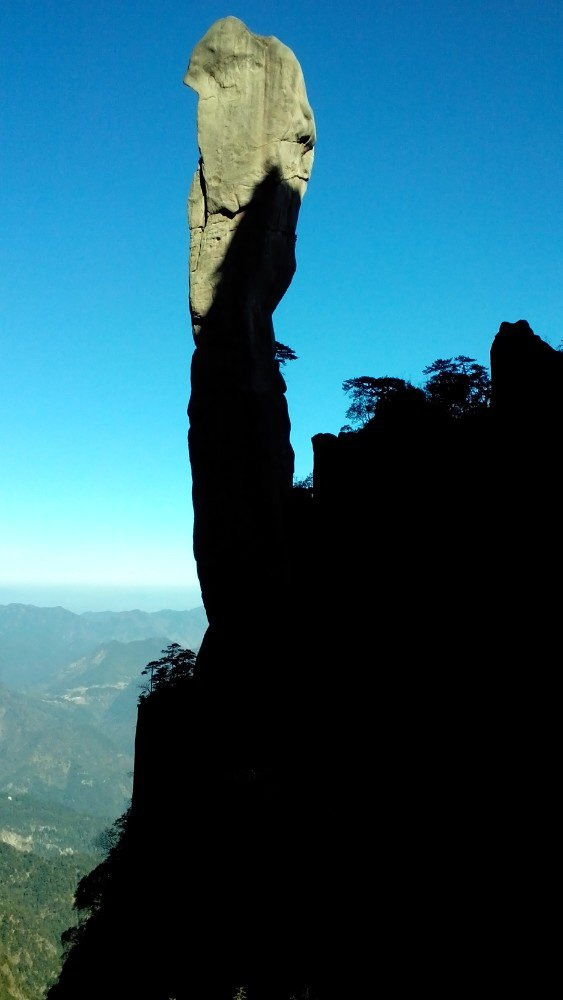 巨蟒出山右侧面这也有服务站可以坐坐吃吃,我拍完照坐了会再吃了点面包和水,这巨蟒128米石柱其实不是整根而是当中断开的,有经过游客说来次小地震的话估计就要倒掉,走很近时挨着栏杆我悄悄叮嘱阿蟒:真来地震一定要挺住啊!近看站下方仰视感觉更震撼!