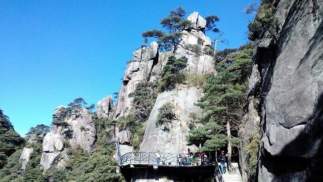 吃完稍微坐休后再往东下台阶,路上人很少了只有两对年轻情侣,前面一对的女的腿酸的在一级一级侧身下了,我跟旁边男的说还好她没要你背下去,后面一对听到男的学赵本山说“这个可以有”,前面一对那男的马上大叫起来:她一米七啊!我“安慰”他:身高不是问题...后面男的还和我开玩笑说三清山上疯妹子挺多的小心被俘虏啊,要保持纯洁,我听了觉得他挺逗的,旁边他女朋友说你上了山妖话挺多的吗?!他解释开开玩笑话能消除疲劳啊!我回他:牢记党的嘱托...然后说正题交流了解下他们住宿地点费用的情况, 她们都住日上山庄这里位置最方便去四面八方能避免回头路,标房五百多,三人房六百多也网上订的,是晚7点到八点半热水澡,经过看到一荤二素快餐40元中午也能现炒菜...