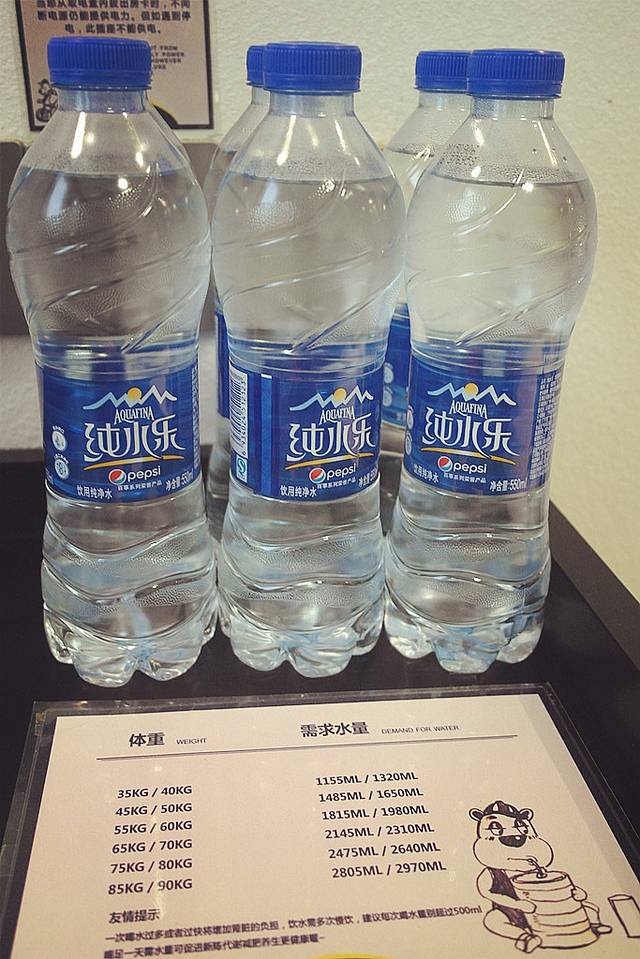 每个房间都配备6瓶矿泉水,而且真的是免费哟。旁边有爱心小贴心教你如何正确适量饮水。
