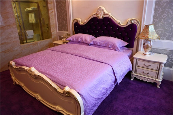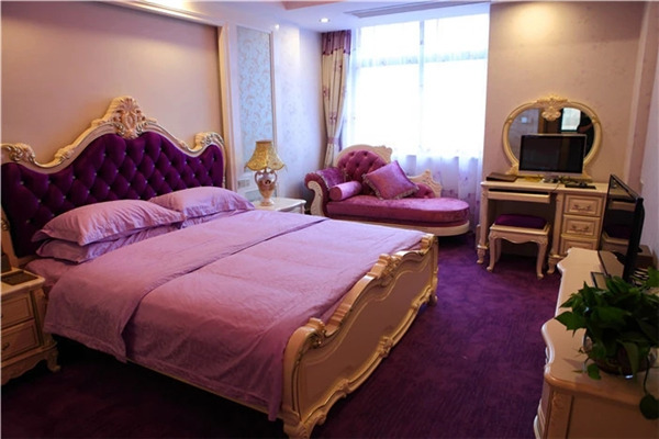 我的房间是紫色色调,一整个房间都是。设计风格是有点简欧风格的,特别是哪个白色漆、紫色靠背的大床,很是舒服。被单被套都不是其他酒店那样白色的,而是淡紫色的,是我最喜欢的颜色。