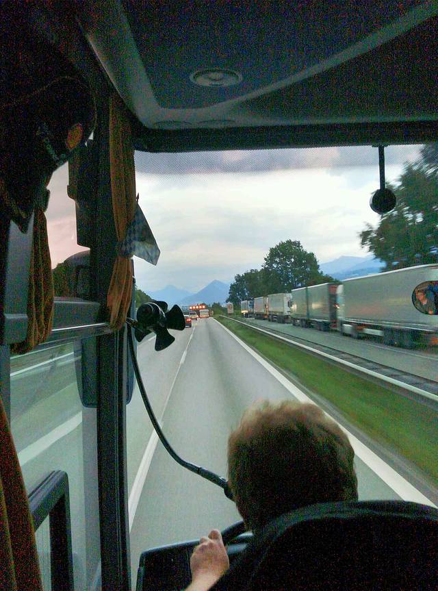 德国慕尼黑——奥地利因斯布鲁克,大巴上,司机大哥在喊麦,歌词大意:欢迎来到欧洲,请系好安全带