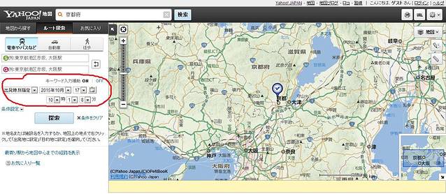 关于地图这个事儿我想额外提一下的,就是善用yahoo地图的日文网页版。出发前我在做攻略时候,发现国内是可以登日本雅虎无压力的,就研究了一下日文版雅虎地图。之后发现雅虎地图之强大真的甩开度娘好几条街。首先就是精细度非常高,比例尺可以干到1:20m,精度非常高。其次指定出发点和终点以后,可以直接出具换乘方案,包括步行、公交、驾车三种方式。第三就是在选择导航方案的时候,是可以选择时间的!!可以选择时间!!可以选择时间!!重要的事情说三遍。