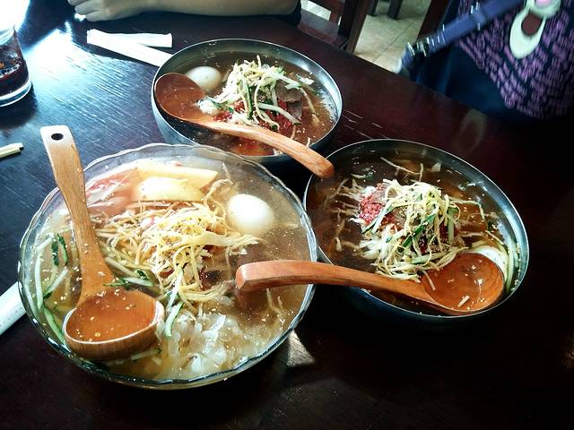 延吉冷面!就在延吉大学校门正对面的服务楼一层,那个玻璃大碗的是所谓的豪华冷面,就是配料比较丰富啦,不是正餐的话两个人一份尝尝就可以啦~冰爽够味!