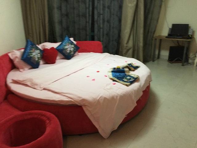 房间非常的大,单间配套,有个饭厅,电视液晶屏的,电脑有宽带,WIFI也有,我第二天才用。大圆床、长饭桌,红色的沙发,吹风机、微波炉,小冰箱、开水壶,衣柜,晾衣架、衣架十来个、另外还有个淇淇妹最喜欢的秋千。