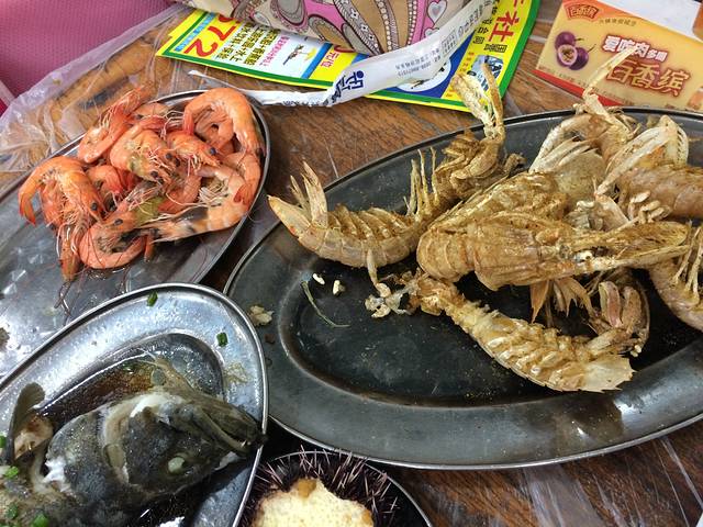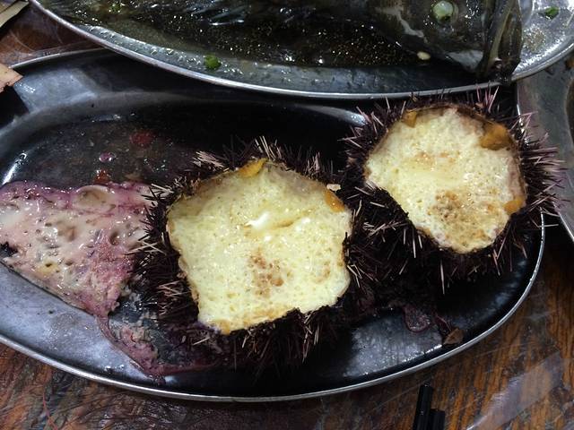 总体来说我还是比较满意的。基围虾活蹦乱跳的,25一斤;皮皮虾个起码比我们那大一倍,35一斤;石斑鱼肚皮和背脊都没有刺,决定以后回重庆也给幺儿卖这种鱼来吃。35一斤,海胆15元两个。大概用了一百三十元左右。