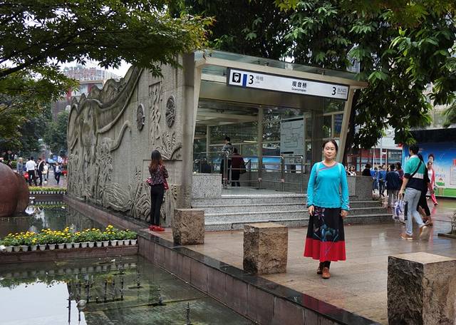 吃饱串串,我们由观音桥乘3号轻轨转2号轻轨,前往李子坝,去看轻轨穿楼。李子坝,轻轨从一座背山临江高楼的5楼穿过,5楼设立站台,楼下是店铺和写字间,楼上是住户,实用方便,节约建设成本,临江的一面有自动扶梯,逐层上下楼进站出站,背山的一面,出站就是马路,也就是说山坡形成5层楼的高度分隔了2个方向,看轻轨穿楼,临江的一面出站后效果更佳。站台上有十几位年轻的游客看穿楼,而出站观赏的只有我们母女。这就是我们的旅行宗旨,看独特新奇的,自然人少了。