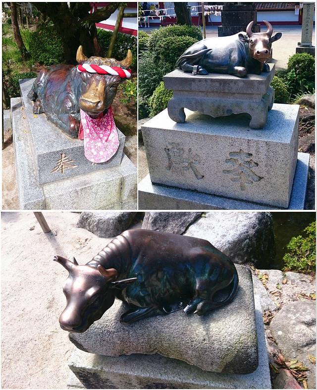 传说属牛的菅原道真死前授意说自己一定要被牛托着运送到埋葬地,牛在哪里停下,他便葬于哪里,后来人们便修筑了铜牛。据说摸一摸牛角会长智慧