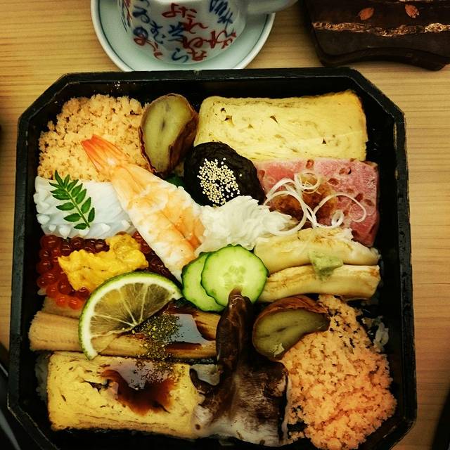 博多阪急百货9楼电影院旁的寿司店やま中。看攻略寻来的,但一开始上的菜单都是寿司套餐,且都是文字,以为不是这一家,既来之则安之,点了一份寿司套餐。食材相当新鲜,厨师就在我们面前选材料,握饭团。没吃到想吃的,不甘心,就拿出攻略上的图片问有没有这样的寿司饭,啊,原来店里还有另一份菜单,果断下单!