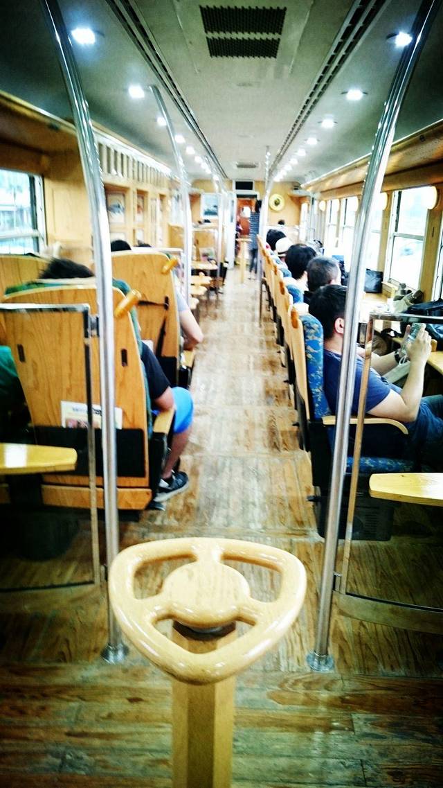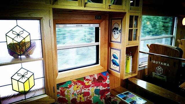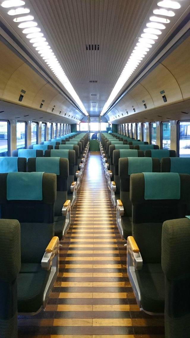 きゅうしゅうおうだんとっきゅう,外表看上去有些老旧的九州横断特急,车厢里面复古感十足,地面、座椅、行李架等都是木制的。在日本,像这样的观光列车,速度都不是很快,乘坐这类列车可以悠闲地欣赏到窗外的美丽风光,这才是旅游的目的。